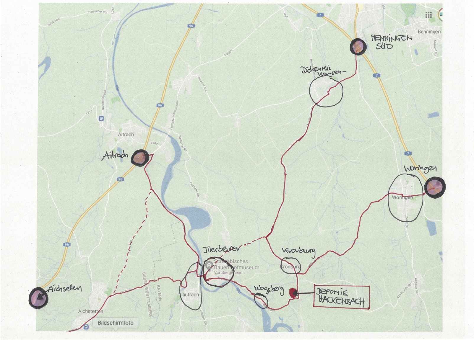 …. ab hier entweder durch Illerbeuren, die extrem enge Durchfahrt Wagsberg, wo regelmäßig die LKWs auf dem Gehwegen fahren, dann durchs Nadelöhr Hackenbach, wo schon heute kaum 2 PKW aneinander vorbeikommen, geschweige denn 2 LKWs