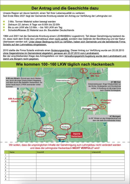 Woringen hat mit den Kiesgruben und den Industriebetrieben Richtung Wolfertschwenden bereits jetzt schon viel LKW-Verkehr. Von der Autobahn runter geht viel Verkehr gerade aus Richtung Wolfertschwenden, nach Kronburg geht es rechts in den Ort, vorbei am Gasthof Adler und Bäckerei und Metzgerei im 90° Winkel ums Kriegerdenkmal. Die Einmündung Kriegerdenkmal ist – egal wie man fährt – kompliziert und eng. Zwei LKWs kommen nicht aneinander vorbei. Dann geht es steil die Brunnenstraße hinauf, auch eng und schwierig und dann mit vielen Kurven nach Kronburg, südlich am Schloss vorbei rechts den Berg runter zur Grube