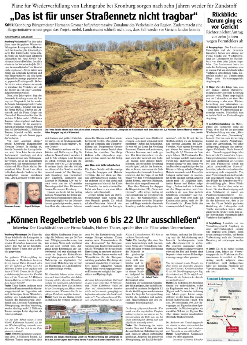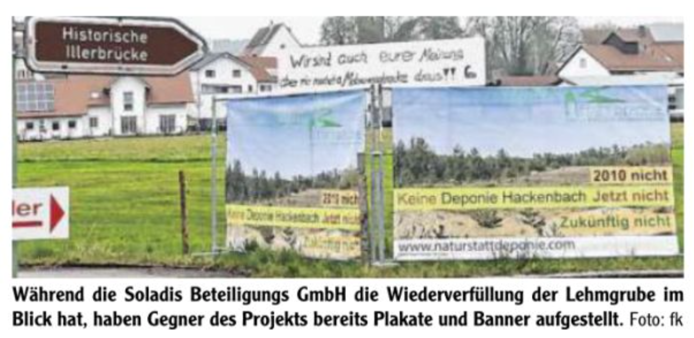 Aber heute am 05. Mai ist eine ganze Seite zum Thema Lehmgrube Hackenbach in der Memminger Zeitung. Mit einem Bild unseres Banners in der Memminger Zeitung – im Interview mit Hubert Thater, dem Antragsteller. Text „blau“ ist der Text aus der Memminger Zeitung. Also: keine Scheu, ran an die Feder und schreiben.
