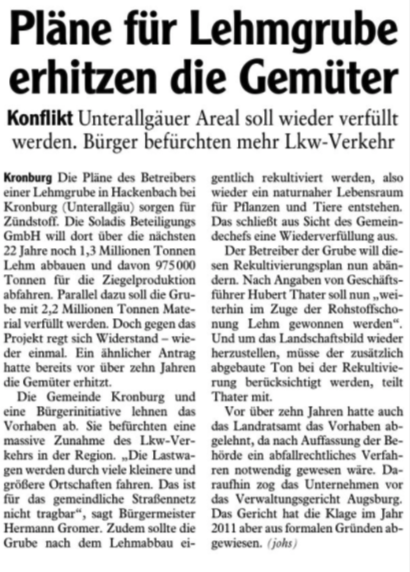 Kronburg/Hackenbach: Vor über zehn Jahre hatte die geplante Wiederverfüllung einer Lehmgrube in Hackenbach bei Kronburg für Zündstoff gesorgt. Die Winterrieder Firma Soladis wollte die Grube nach erfolgtem Lehmabbau mit rund 800 000 Kubikmeter Material befüllen. Letztlich scheiterte das Vorhaben im Jahr 2011 „aus formalen Gründen“ vor Gericht (siehe Infokasten ). Zuvor hatten sich bereits die Gemeinde Kronburg und eine Bürgerinitiative, die sich eigens aufgrund des Antrags gegründet hatte, gegen das Projekt gestellt. Sie befürchteten unter anderem eine massive Zunahme des Verkehrs, der auf die Bürger im Fall einer Genehmigung zukommen würde.