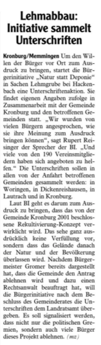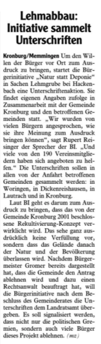 Kronburg/Memmingen Um den Willen der Bürger vor Ort zum Ausdruck zu bringen, startet die Bürgerinitiative „Natur statt Deponie“ in Sachen Lehmgrube bei Hackenbach eine Unterschriftenaktion. Sie findet eigenen Angaben zufolge in Zusammenarbeit mit der Gemeinde Kronburg und den betroffenen Gemeinden statt. „Wir wurden von vielen Bürgern angesprochen, wie sie ihre Meinung zum Ausdruck bringen können“, sagt Rupert Reisinger der Sprecher der BI. „Und viele von den 190 Vereinsmitgliedern haben sich angeboten zu helfen.“ Die Unterschriften sollen in allen von der Anfahrt betroffenen Gemeinden gesammelt werden: in Woringen, in Dickenreishausen, in Lautrach und in Kronburg.