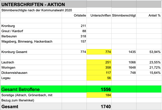 - In der Gemeinde Kronburg hat die absolute Mehrheit der Stimmberechtigten unterschrieben, gerechnet nach den Zahlen zur Kommunalwahl 2020.