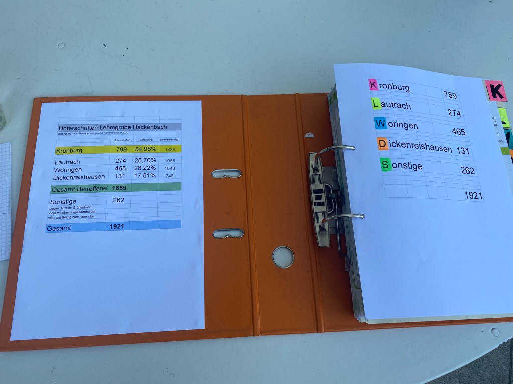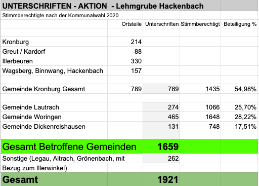 Insgesamt konnten 1921 Unterschriften gesammelt werden. „Dies ist ein eindrucksvolles und eindeutiges Zeichen, dass die Bürger*innen die Verfüllung nicht wollen und dafür eintreten, dass die Beschlüsse des Kronburger Gemeinderates Bestand haben müssen“. so der Vorsitzende Rupert Reisinger. Alle Genehmigungen zum Lehmabbau sehen ausdrücklich KEINE Verfüllung vor.