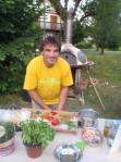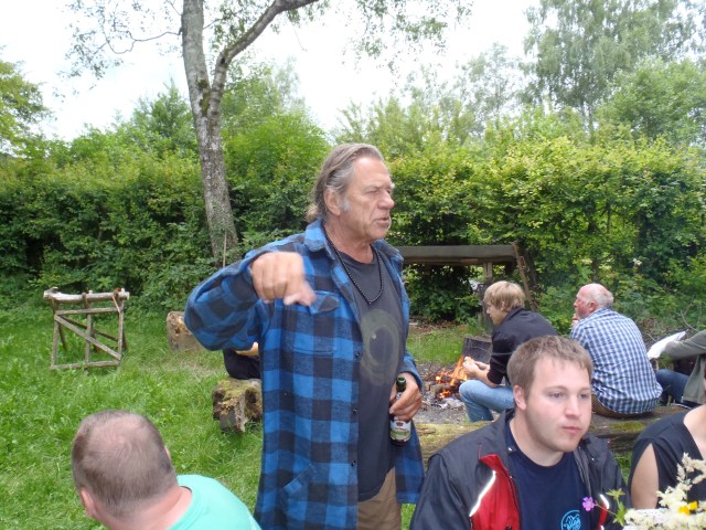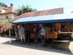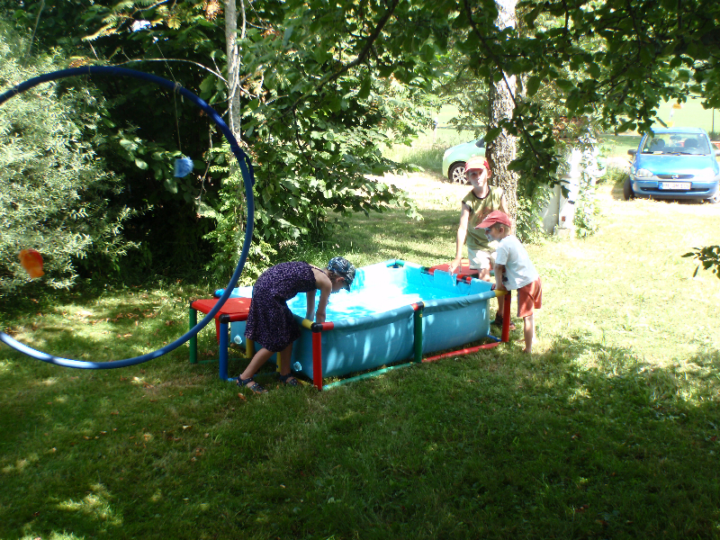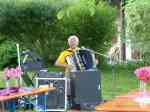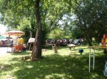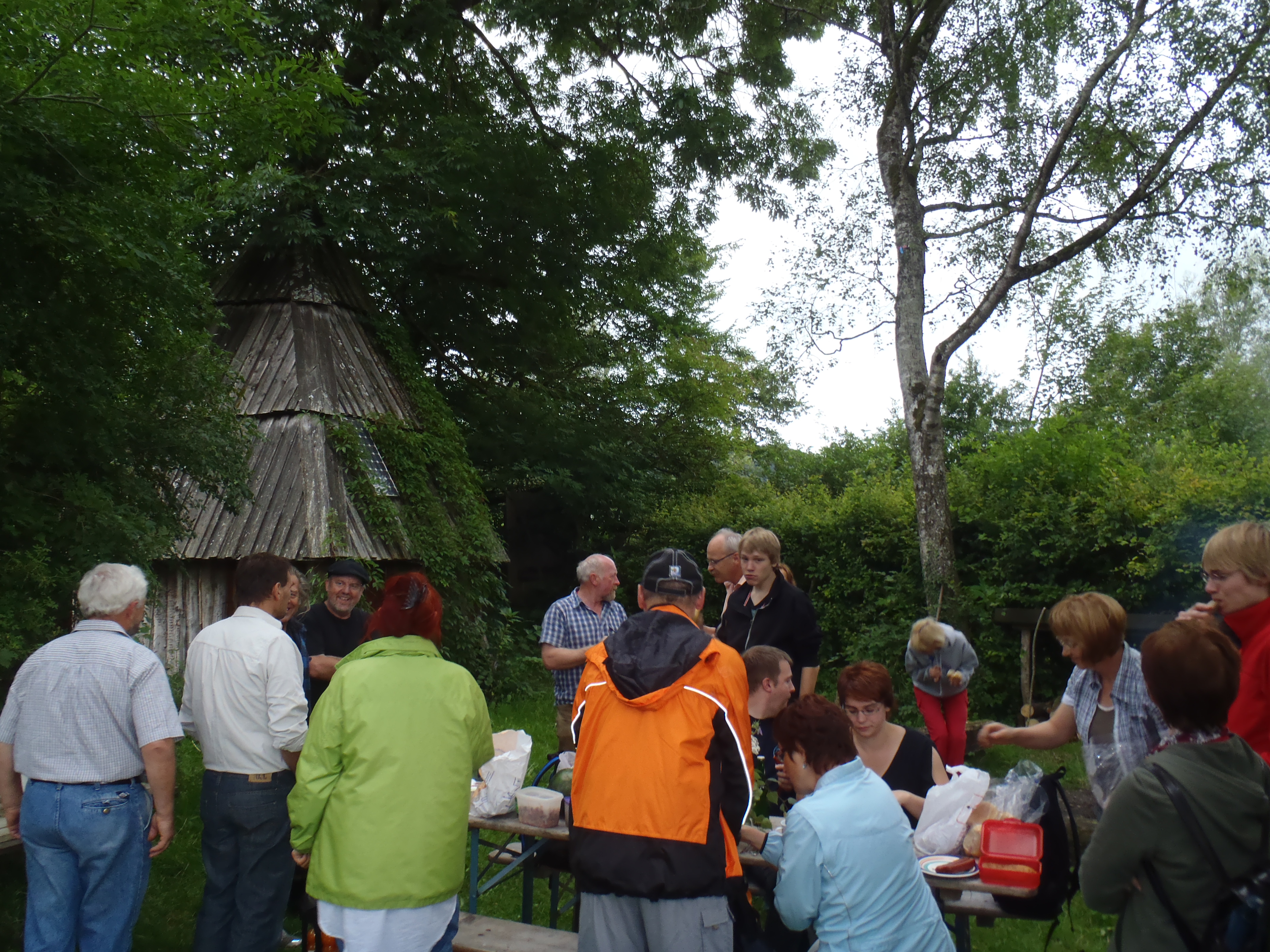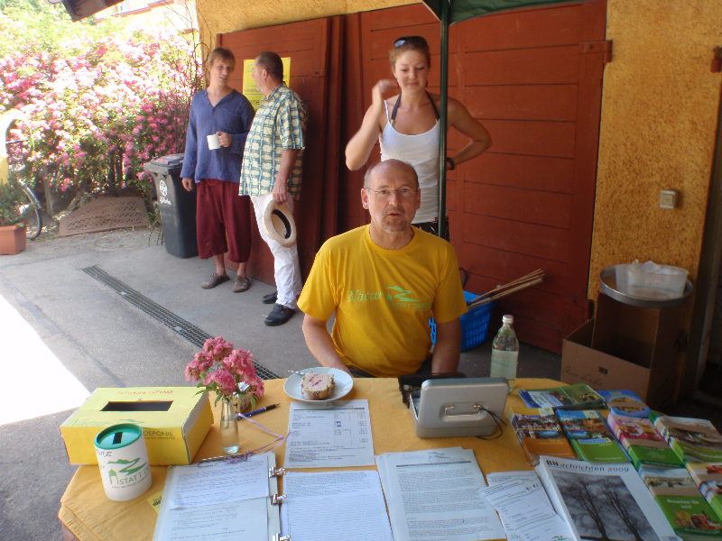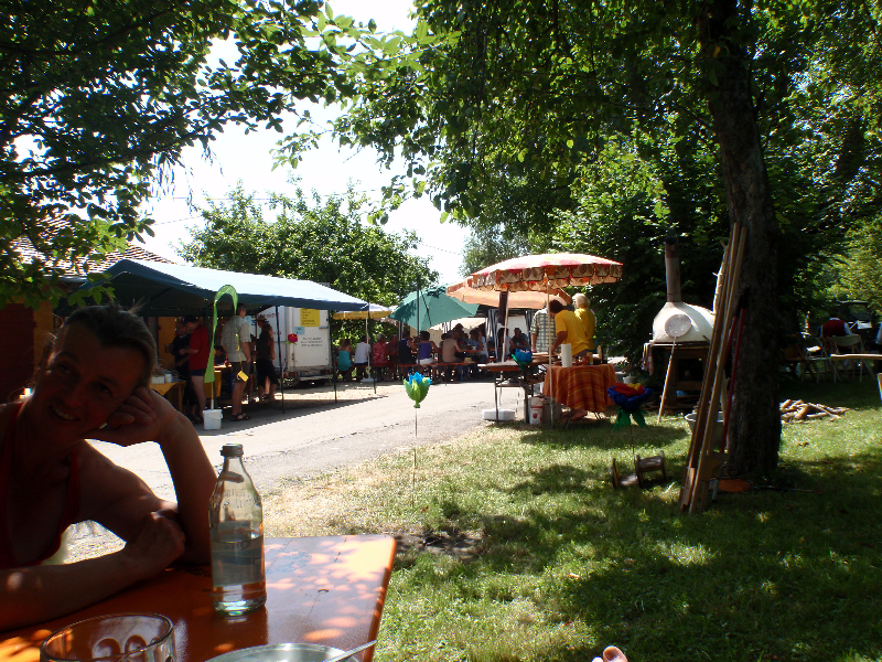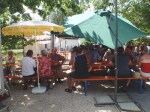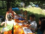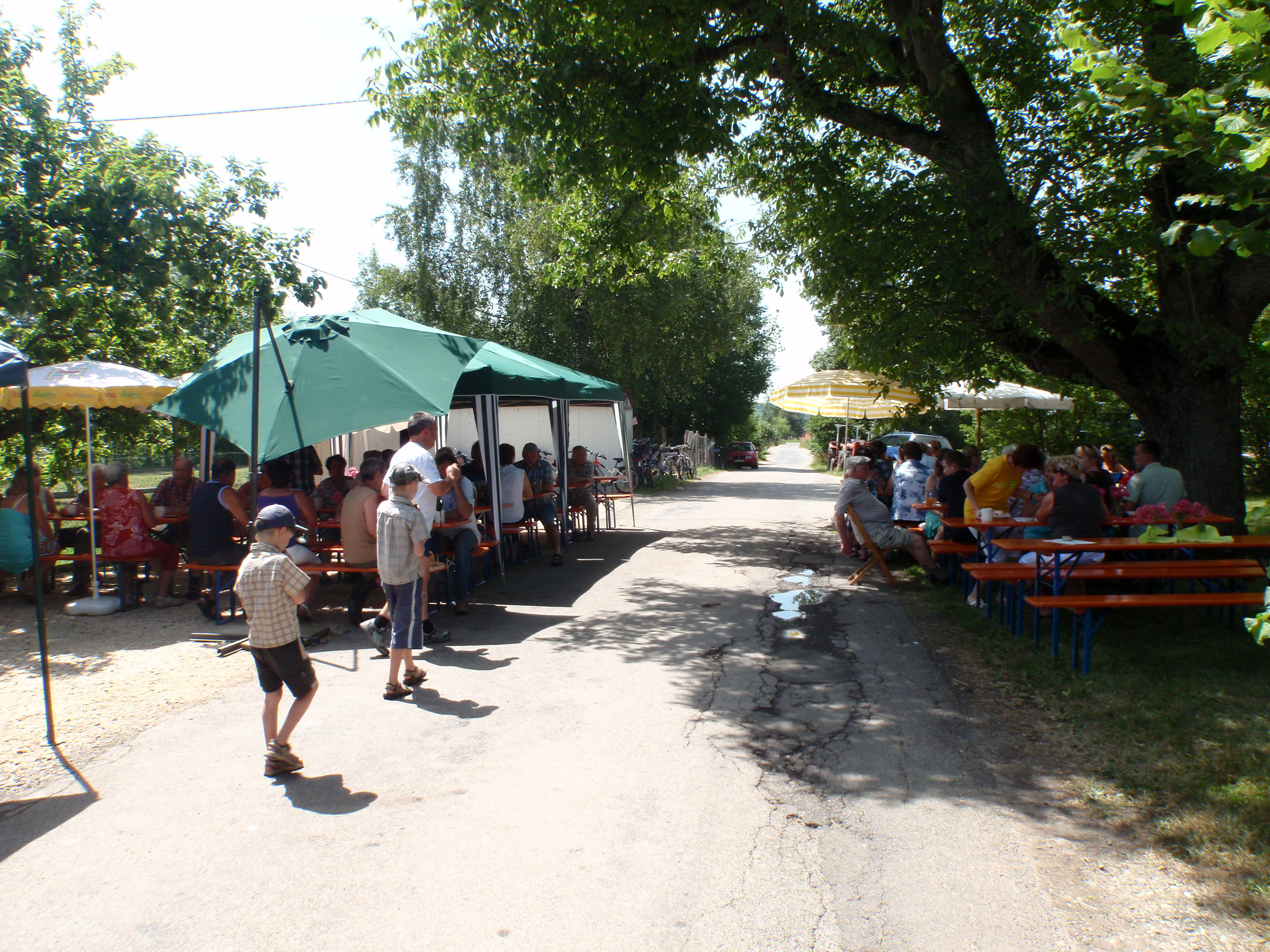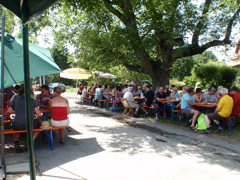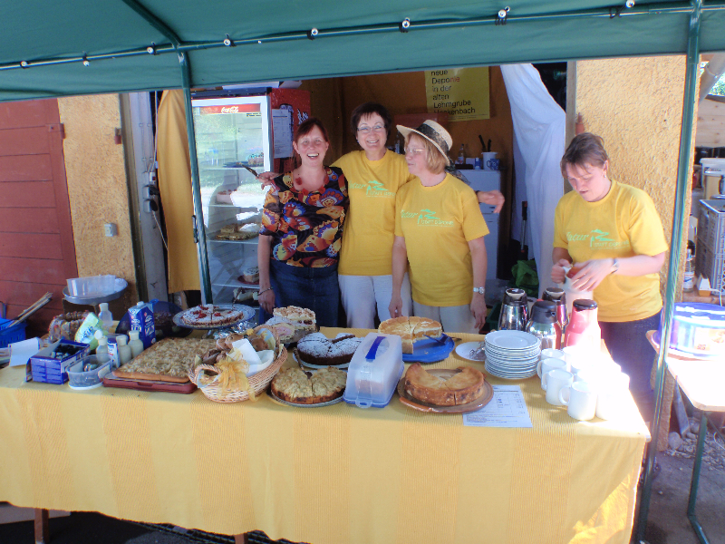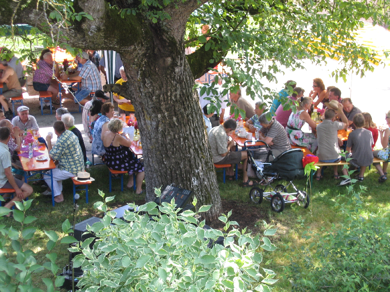 Diese Bilder vermitteln – denken wir – einen Eindruck von der schönen Atmosphäre, unter dem Nußbaum und unter den Sonnenschirmen, von den Kindern in der Kinderecke, von unserem Service (siehe Photo an der Kuchentheke, der Service bei den Getränken ließ manchmal doch zu Wünschen übrig, siehe das Photo der Herren mit dem Rücken zur Kamera.